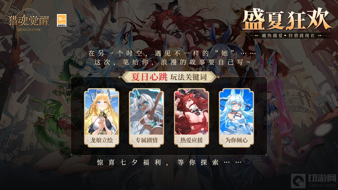 “夏日心跳”七夕特别活动即将开启!在平行宇宙的另一个时空里,游骑兵将开启一段别样的冒险与探索。这里,没有无尽的可怕兽潮,也没有危机四伏的狩猎;这里,游骑兵将与“龙娘”们相遇,与她们发生各种有趣的故事。助力龙娘出道梦,为你心仪的“她”应援投票,可以建立感情羁绊,解锁独家专属剧情,更有超多好感度奖励!偶像人气热度更将影响龙娘的全服排名,应援冠军龙娘或许还有机会获得专属定制猎魂。