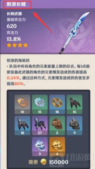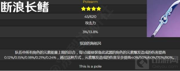 2、断浪长鳍是一把4星长柄武器,属性有基础攻击和百分比攻击力。