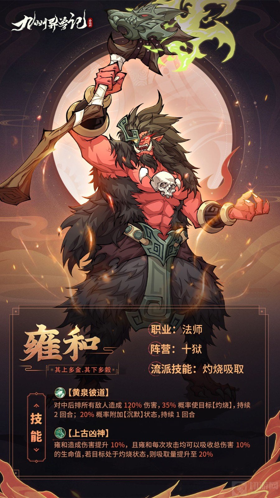 4、被动技能:上古凶神,雍和造成伤害提升10%,且雍和每次攻击均可以吸收总伤害10%的生命值,若目标处于灼烧状态,则吸取量提升至20%