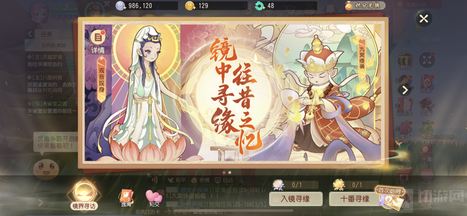 近期镜中寻缘【往昔之忆】卡池开启,特定往期行历卡限时概率提升,其中金色行历卡【九冥侵袭】、【观音现身】占所有金卡出率的50%;紫色行历卡【第九回 重修山河图】、【子不语】占所有紫卡出率的50%。有需要的少侠可在2022年8月16日12:00前享受概率加成!