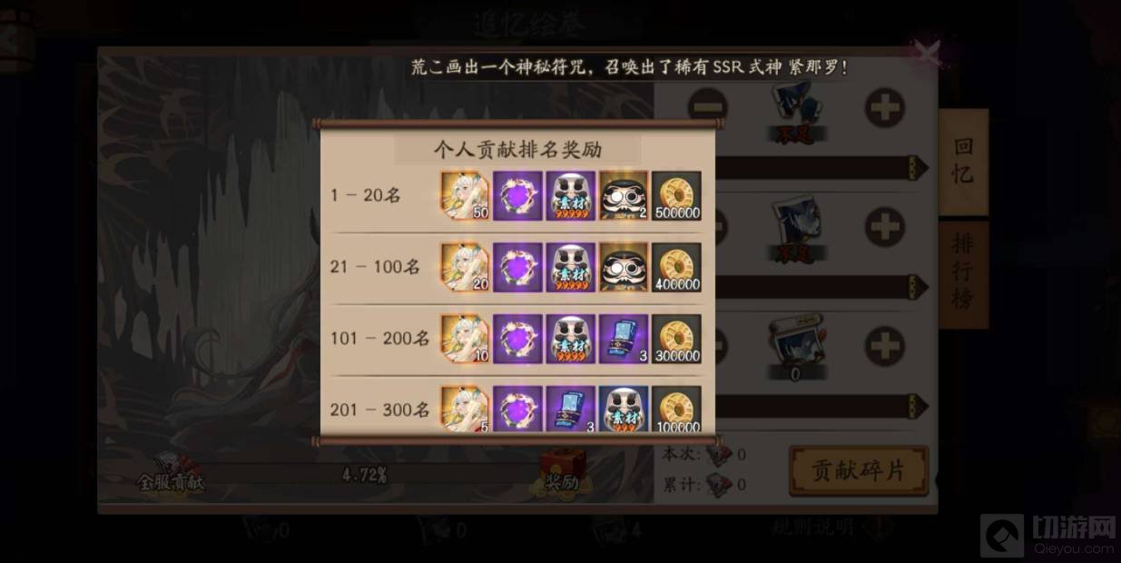 3. 排名前三柒三三游戏列的大人可获得本次绘卷式神,SSR面灵气的契约书碎片、高星奉为达摩、御行达摩、神秘的符咒以及大量金币奖励。