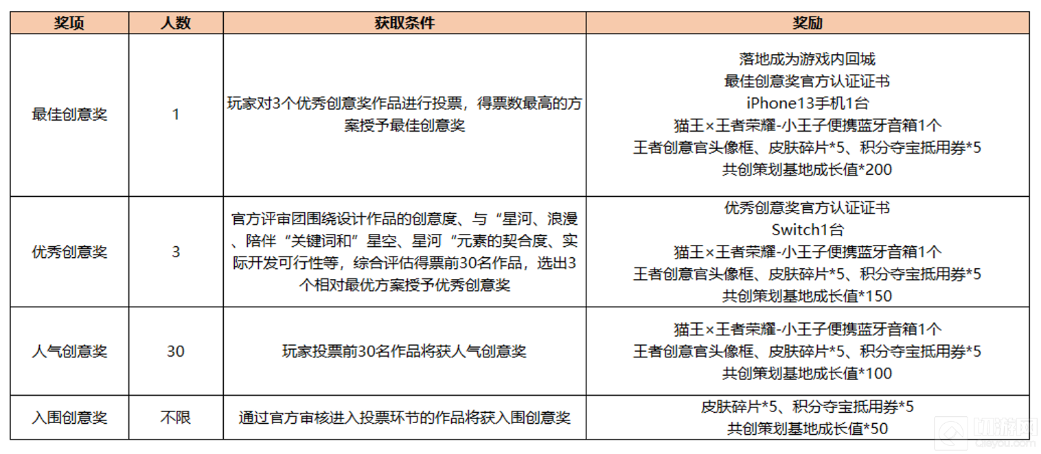 账号等级≥30级的玩家对3个优秀创意奖作品进行投票,得票数最高的方案授予“最佳创意奖”。