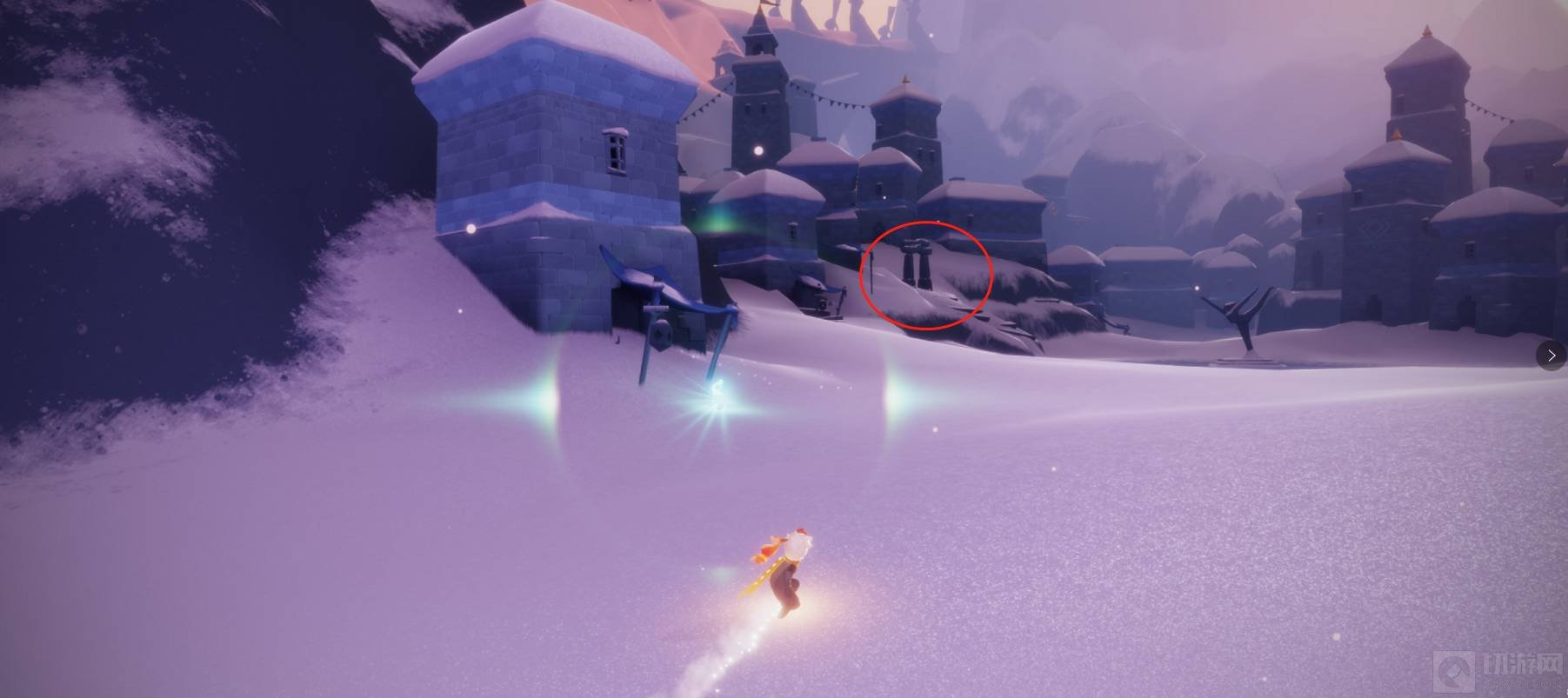 5. 第二次乘船后画面会直接到达雪隐峰的入口,再往前走一点点就到达雪隐峰了,这里有一个光之翼和一位先祖。