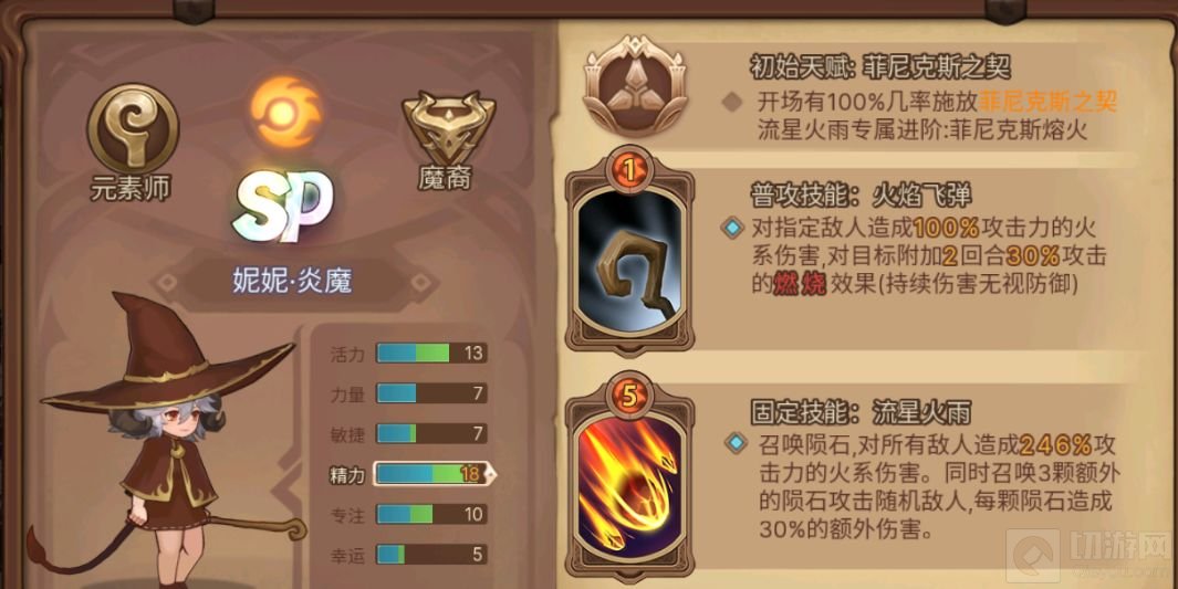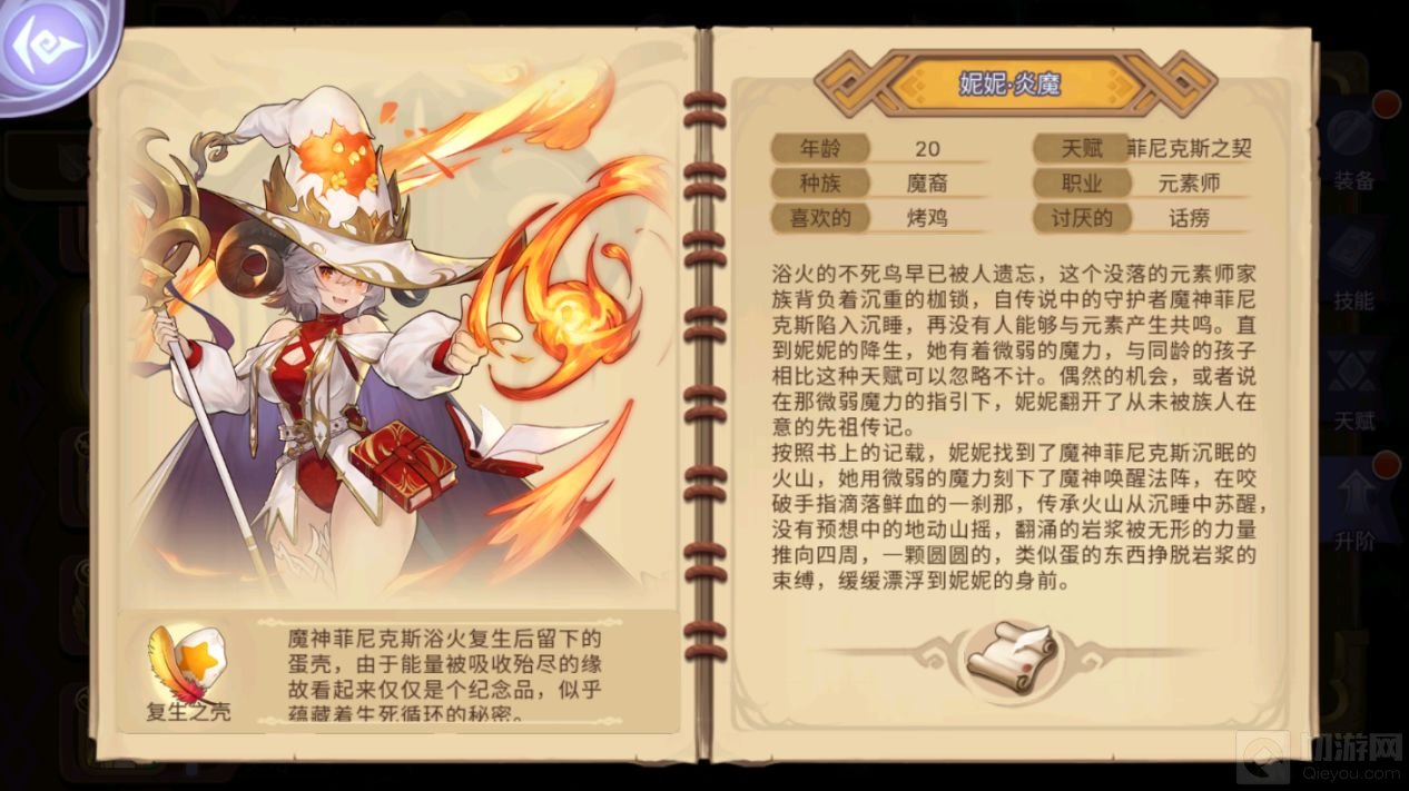 1.炎魔妮妮天赋,菲尼克斯之契,妮妮每场战斗可以复活1次,需消耗所有火灵,妮妮获得30%伤害减免,但在受击时消耗1只火灵,妮妮每回合可获得一张额外的不消耗能量且不占用回合的菲尼克斯熔火,需要消耗3只火灵释放,全体友军附加魔神随从印记:火系伤害+30%,暴击率+10%,每次释放火系技能将为妮妮回馈1只火灵,战斗开始获得3只火灵。