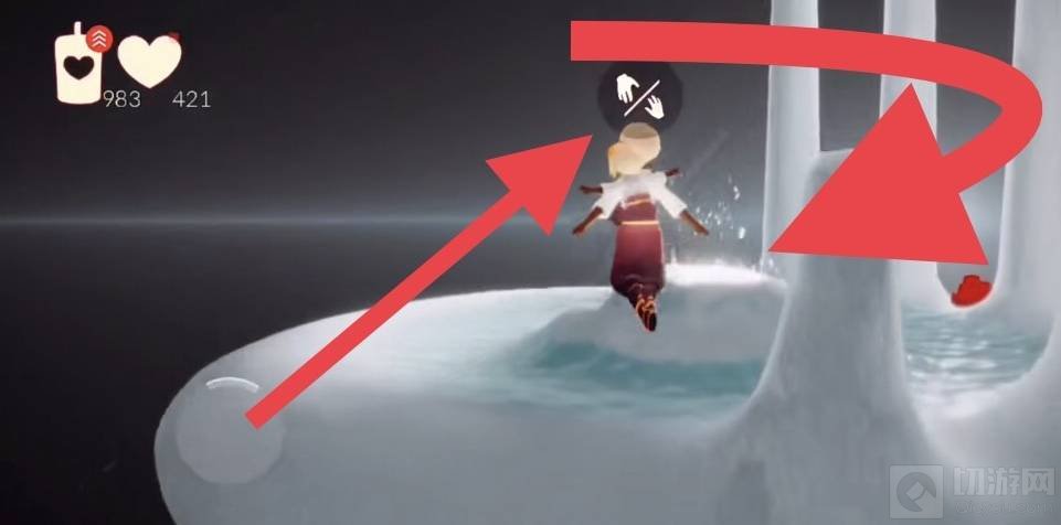3、在起飞过程中,头上会出现双手分开的标志,点击这个标志之后就可以控制方向盘了,当角色飞到空气试炼最高的终点之后,就点击这个标志控制方向来到终点平台上即可。