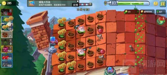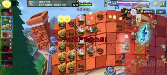 2、本关推荐茄子用来复制花盆,然后把能够带上的爆炸植物、秒杀植物(比如葡萄、樱桃、辣椒、窝瓜等等)全部带上,然后等投罐车出来,出一个投罐车杀一个。然后,产阳光,种猫尾草,输出跟上了,过关简简单单。
