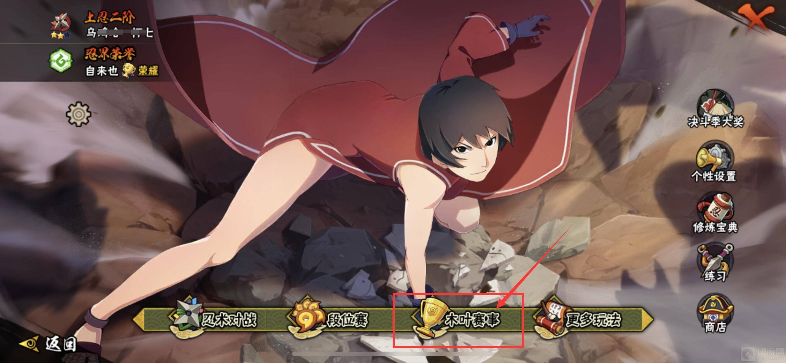 1、先从主页面进入到决斗场中,然后可以看到下方右四个选项,忍术对战、段位赛、木叶赛事、更多玩法,将木叶赛事打开并进入。