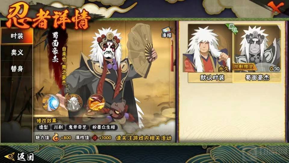 1、川剧自来也是他的限定皮肤,这款皮肤的名字叫做蜀面豪杰。
