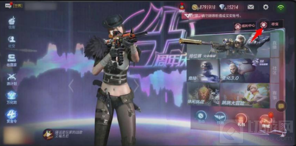 1、打开cf手游主界面,点击右上角的“寻宝”功能。
