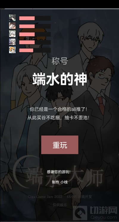 1、端水大师是光与夜之恋手游的玩家自制的娱乐向同人小游戏。这个名字就玩了一个端水大师的梗,指的是能够同时和多个人处好关系,做到谁也不偏颇的社交达人。