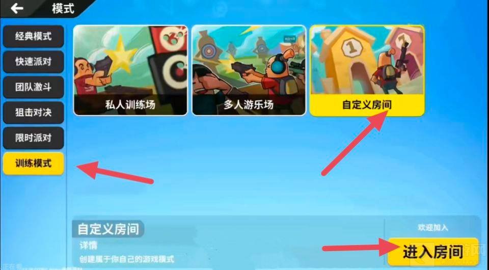 1.进入游戏后,在训练模式点击自定义房间。