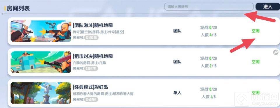 2,点击进入房间后,选择空闲的房间或输入房间号。点击进入即可成功进入别人的自定义房间。