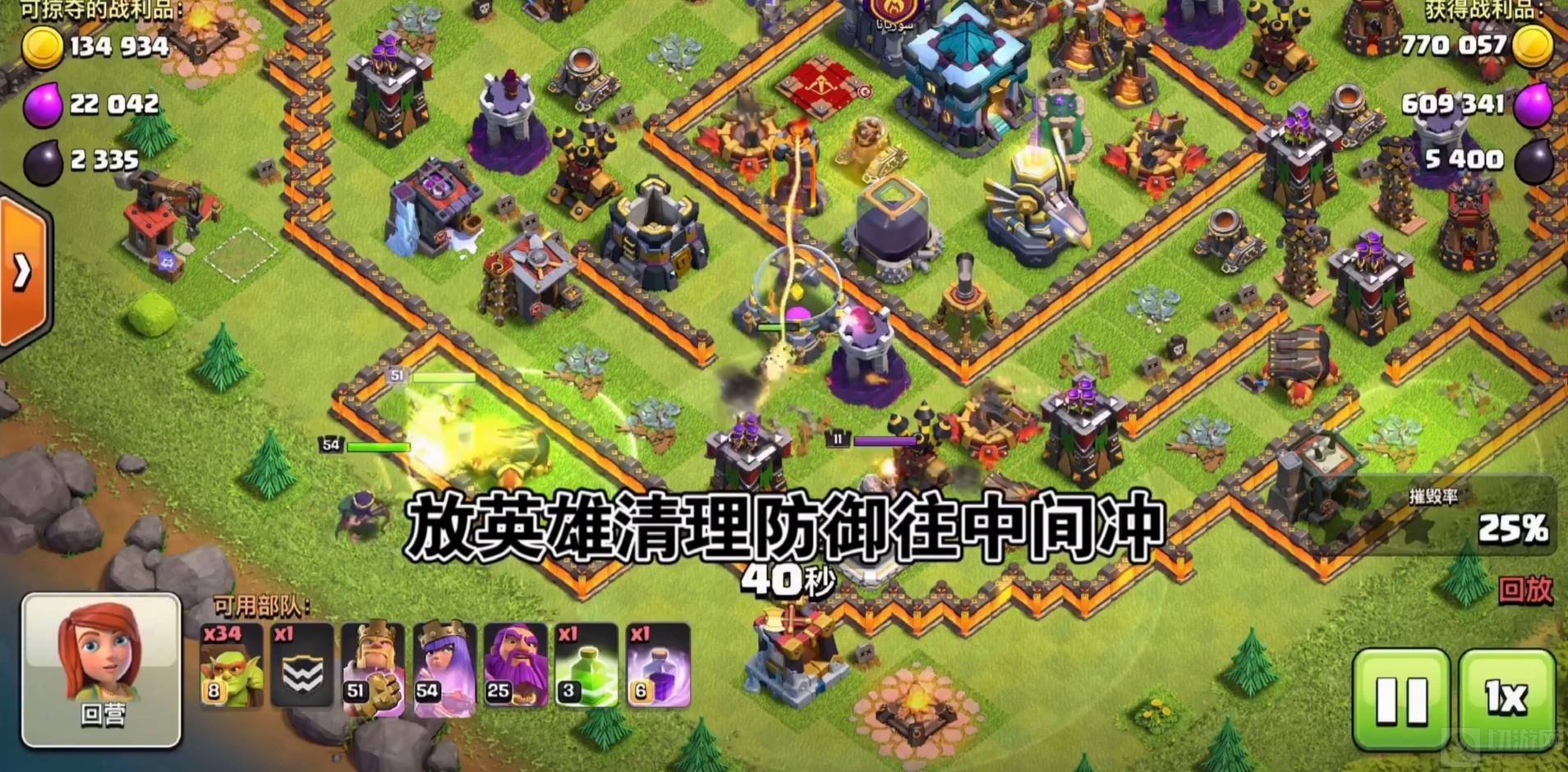 3.接着放置英雄清理对方的防御工事,并往中心地带冲。