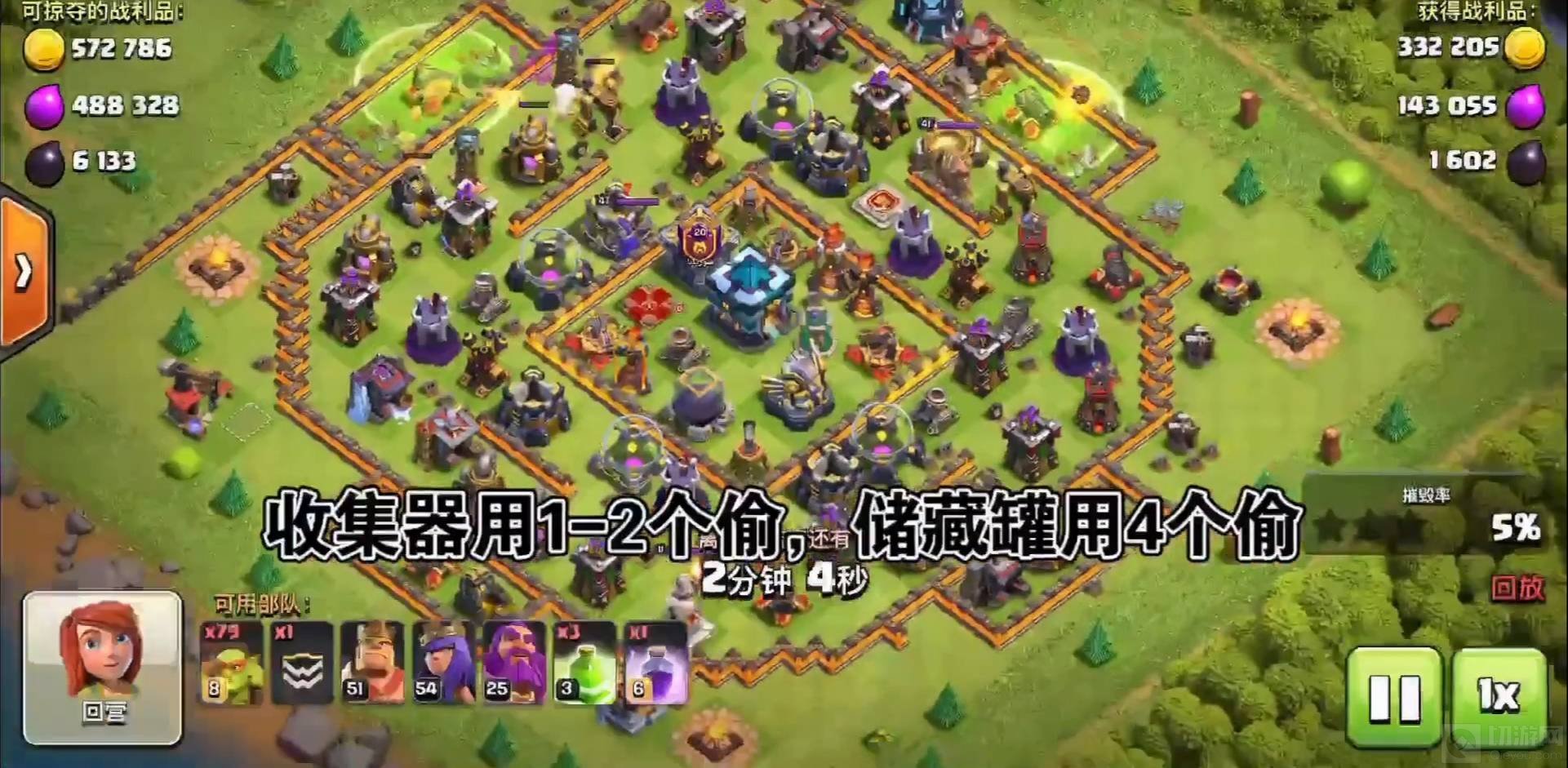 2.然后放小哥布林偷取敌方的收集器和储藏罐,收集器用1-2个哥布林偷,储藏罐用4个小哥布林偷。