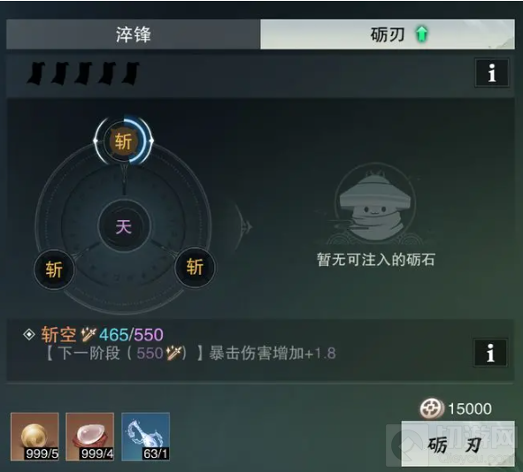 8、 由于淬锋属性无法装备继承,相应的,砺刃属性也无法装备继承。在砺刃玩法中,普通节点可以使用砺石进行强化。点击“砺刃”按钮,会跳出不同种类的砺石供少侠选择,成功后可以提高锋利度,失败后则会降低锋利度。