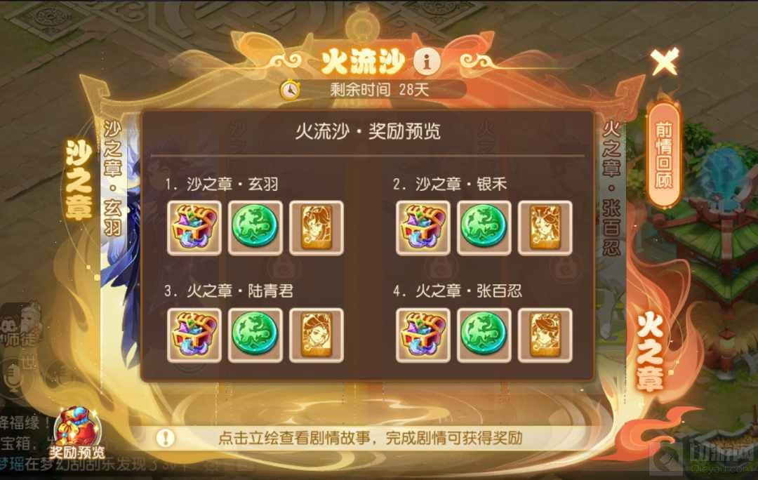本次《火流沙》剧情共有两条故事线,每个故事分别由两位人物分三章为玩家讲述。在玩家完成每个章节的剧情后,系统将会为玩家送上宝石箱子、NPC变身卡、强化石等丰富奖励。此外,玩家还可以解锁《梦幻西游》手游特别为此次剧情所打造的精美插画和视频,享受一番视觉盛宴!