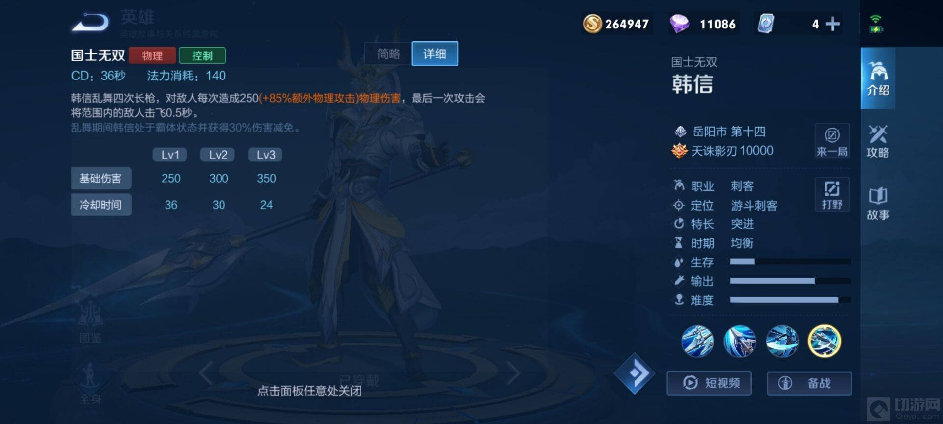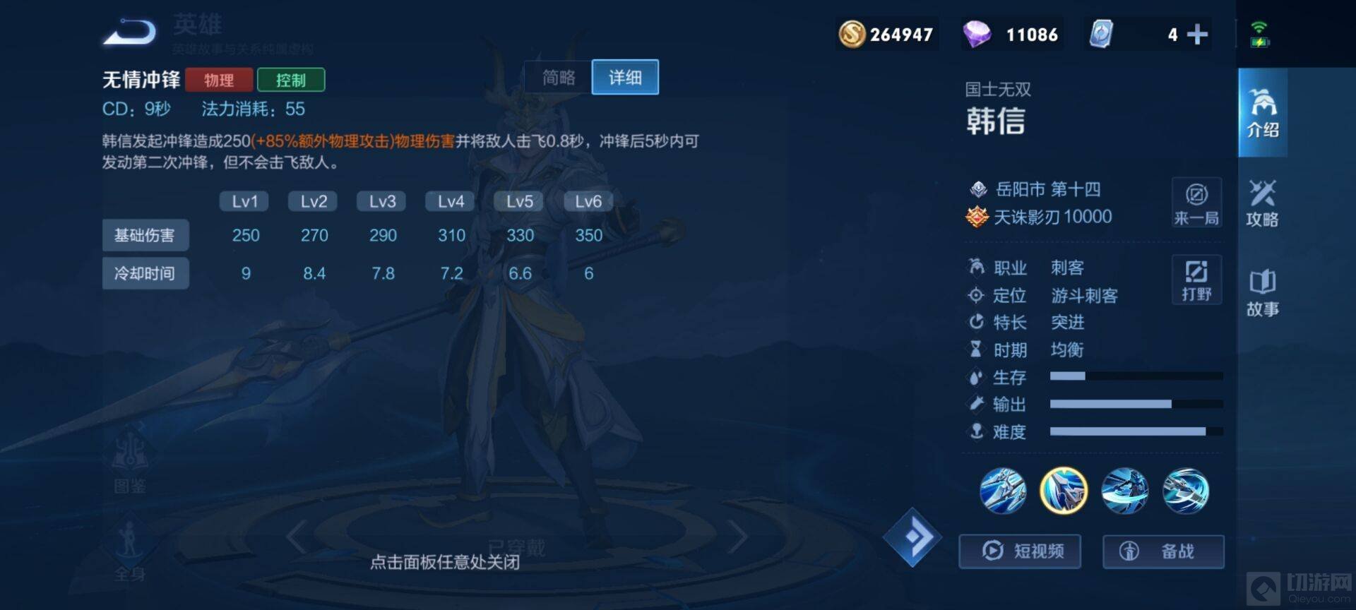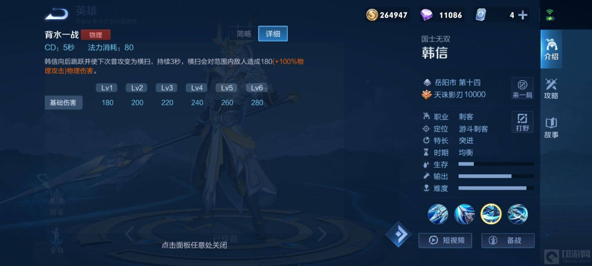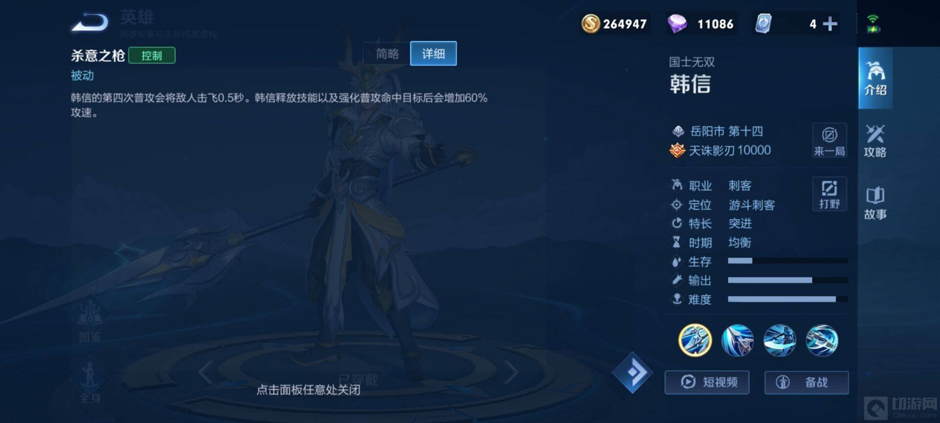 除了这三个技能外,韩信还有一个被动技能,杀意之枪,韩信的第四次普攻可以击飞敌人,并且技能命中目标后增加60攻速。