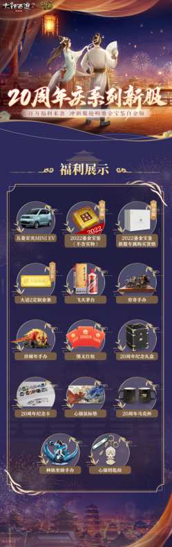 二十周年新服【天女散花】同样开启“盛世20周年”活动,百万福利重磅上线!参与新服活动,有机会抽取五菱宏光MINI EV、大话2定制金条20g、飞天茅台、穷奇手办、2000元情义红包、20周年纪念礼盒等实物奖励,更有概率获得2022鎏金宝鉴白金版新服专属购买资格和2022鎏金宝鉴白金版(不含实物)。