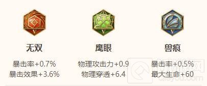 三、铭文选择:十无双,十鹰眼,十兽痕,孙悟空的被动是自带暴击率,无双与兽痕可以增加13%的暴击率,使得初始暴击率能达到33%。通过无双的弥补,使得初始暴击效果为186%,使得输出更高。鹰眼提供物理穿透可以增加孙悟空的穿透效果,增加伤害。