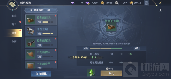 3、接下来是强化,船只强化是提升船装的属性,需要注意,同一部位的船装再更换时自动继承强化等级和属性,这样一来就不会造成我们替换船装时,造成材料浪费的情况了。我们在强化船装时需要消耗银币和强化源石,在到达一定强化次数后,需要进行突破,这时会消耗突破石。需要注意,我们将一定数量的船装强化至指定阶段时,还可以激活精进效果,增加更多额外属性。因此初级的强化,我们可以雨露均沾,将全部船装提升至对应等级,这样增加的属性会比单独强化某一个要高很多。在中后期,再根据角色的特性,侧重去提升所需要的属性即可。