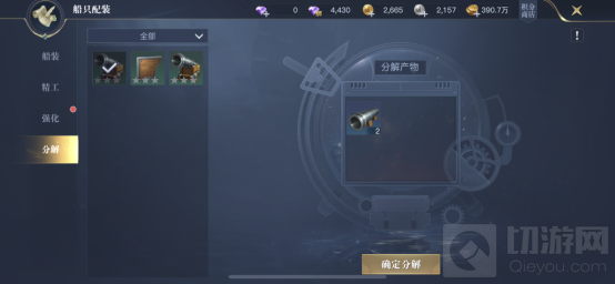 4、最后是分解,我们多余的船装要怎么使用呢?可以放到分解这里,将其变成同类船装精工的部件,用来精工需要加强的船装。这里一定要注意,只分解多余出来的船装,一定不要为了追求某件船装的极致属性,而将装备的船装卸下拿去分解,这样可就得不偿失了。