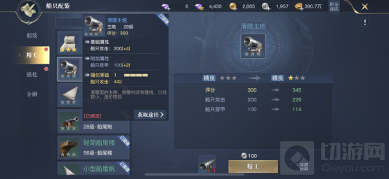 2、其次是精工,精工是对船装进行强化,以便提高船装增加的属性,当我们对单独部位的船装进行精工三次,即可进行升阶,进一步提升船装的属性加成。这里需要注意,我们在船装精工时,需要根据角色定位进行选择,比如输出职业重炮或弹药学家,优先精工船上增加攻击、暴击和穿甲的炮口,这样输出会比较高。像防御型职业,则优先精工增加耐久、防御、各种抵抗等属性的船装,也船只生存能力更强。