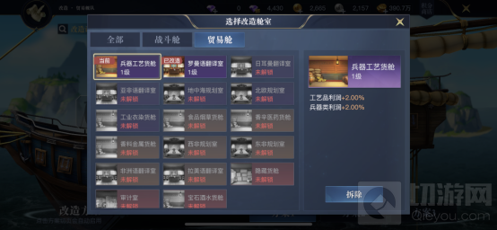 我们在建造船只以后,需要在船舱进行改造,这里的改造可以分为战斗和贸易两种舰队。战斗舰队的船舱改造可以增加各项战斗性能,比如高级火炮舱,可以增加船只高额攻击力;像医疗室则是增加船只受到的治疗效果属性加成,根据职业的需求,我们可以自由搭配。贸易舱可以增加交易属性,比如兵器工艺货舱,可以增加工艺品和兵器类物品的利润;而食品烟草舱则增加食品类和嗜好品类的利润,通过这些属性加成,贸易能力可以大幅度提升。