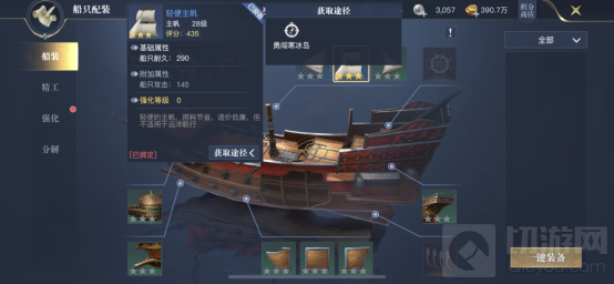 1、船装玩法里分为船装、精工、强化和分解四个玩法,首先看下船装。船装是给船只装备各种道具,比如船首,可以装备各种火炮、撞角和首楼,增加船只的攻击能力。在船身和船尾还可以装备对应的装备,可以提高船只的耐久、防御和各种抗性,这些属性可以大幅度提升船只的作战能力。获取方法上,可以从【勇者航路】、【勇闯寒冰岛】、【神秘梦境】等活动任务重获取。随着我们等级的提升,可以获取的船装也会越来越好,小伙伴记得及时更换新的船装。