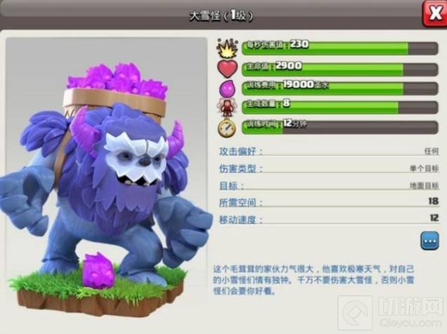 1、雪怪拥有2900点的初始属性,230点的伤害,并会攻击任何目标,所需空间18,12的移动速度。由此看来,大雪怪拥有远超其他陆地兵种的攻击能力,单个的单头地狱塔也有能力单独抵抗并摧毁。雪怪属于就近攻击,并且拥有强大的防御能力和攻击能力,但唯一的不足就是移速和攻速比较慢,而且AOE建筑依然能对大雪怪造成比较大的威胁。也可以通过法术和狂暴来解决这些劣势,且如果击杀了大雪怪,它就会分裂出8个小雪怪,造成爆炸效果。