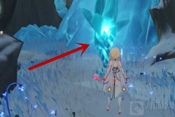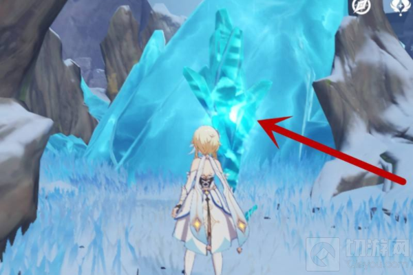 4、跟着带着‘深赤之石’去到坚冰的位置砍一下。