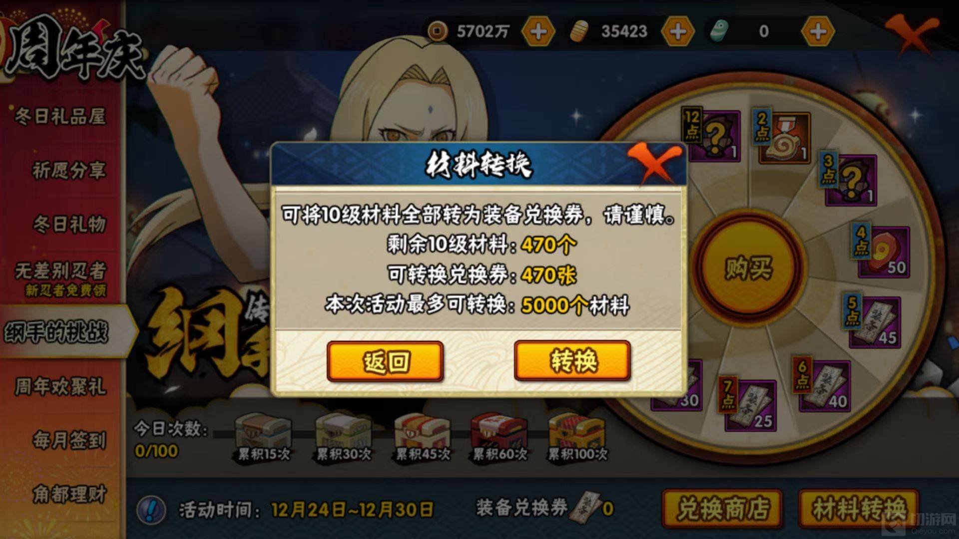 2.纲手的挑战活动纲手的挑战更是有点像资源消耗的活动,通过消耗游戏内的铜币来给玩家们赠送大礼,在材料兑换方面可以帮助玩家们清除掉自身多余的材料来使得兑换更加高阶的材料。