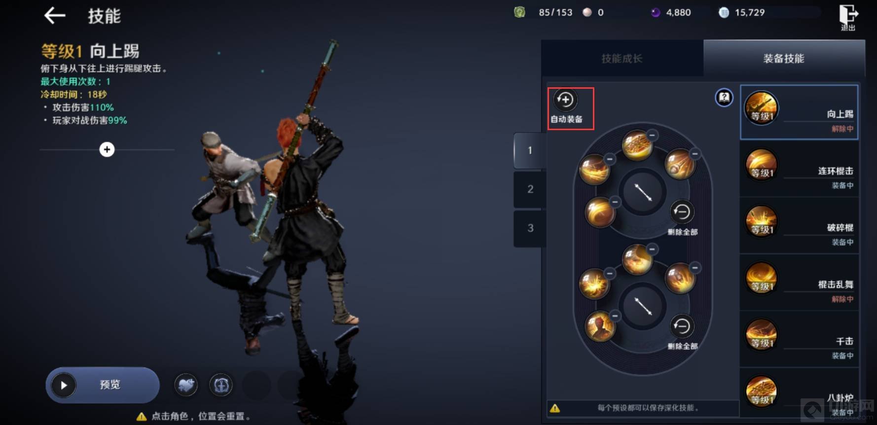 前期建议直接使用技能中的自动装备来搭配技能,这样搭配在刷图的时候可以观察各技能效果。在熟悉技能效果之后,可以根据自己的操作的手法来进行搭配。