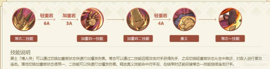 4连招:常态可以通过二技能远程攻击对手获得先手,之后切换轻重岩状态从空中靠近,对敌人进行普攻连击。落地切换加重岩状态使用一、二技能可以快速打出爆发伤害。释放奥义技能命中对手后,在结束时还能衔接常态一技能继续连击对手。