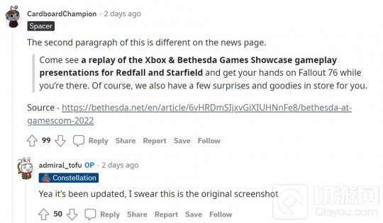 在原来的新闻公告中,B社说到场的玩家能看到《红霞岛》和《星空》的演示,并上手游玩《辐射76》。但后来这一公告被改成了“来观看Xbox+B社发布会《红霞岛》和《星空》的演示回放,并上手游玩《辐射76》”。