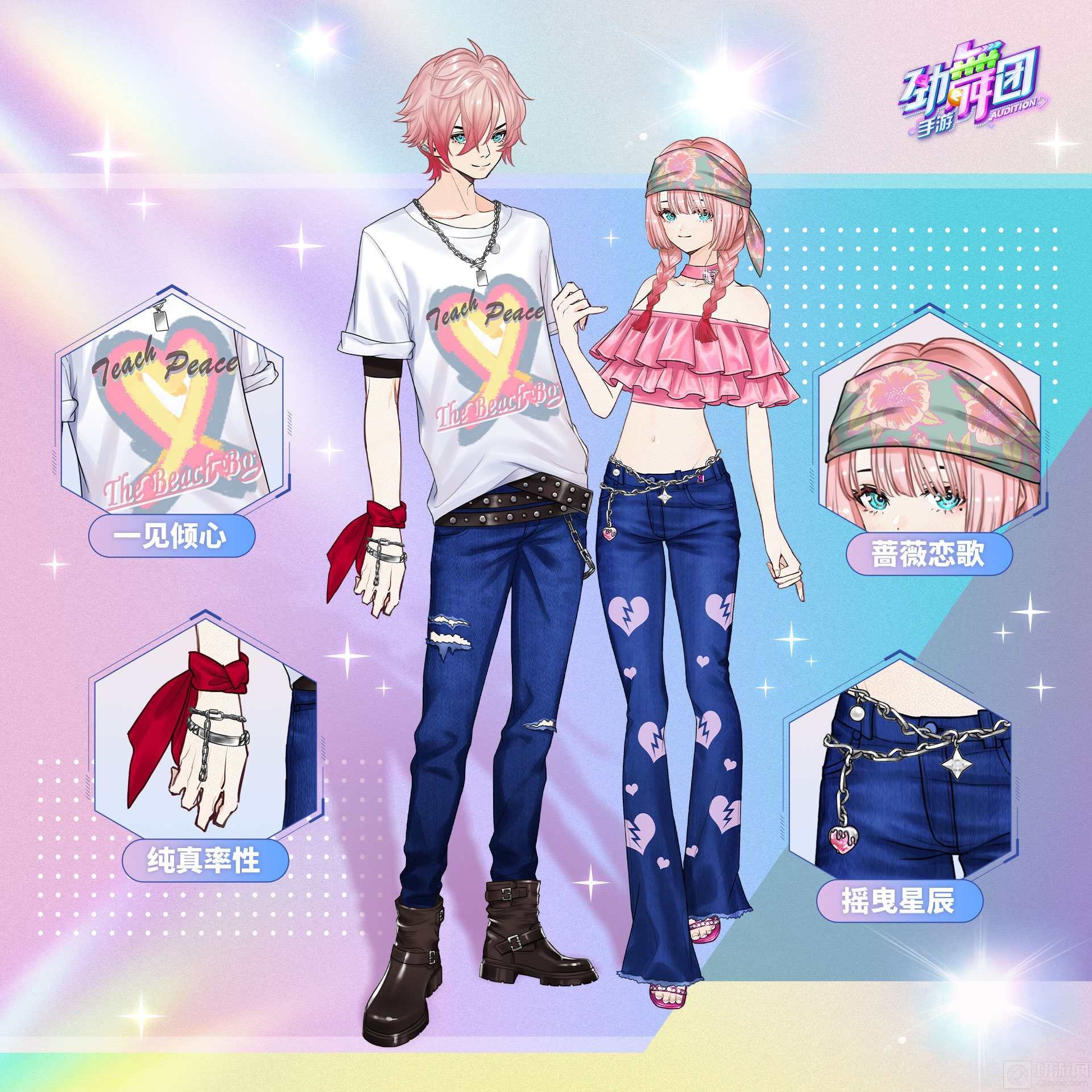 本期商城上新时装甜心男孩、甜心女孩,超甜粉色爱心元素时装带你甜甜蜜蜜度过晚夏,抓住夏天的尾巴,一起劲舞狂欢!甜心女孩采用一字肩粉色上衣,脖间缀以同色系choker,搭配一条爱心元素的牛仔长裤,腰间缀以银链修饰,再配上花色头巾以及粉色凉鞋,整体元气活力、少女感满满!