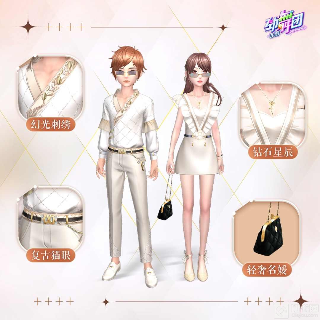 本期上新的活动服饰温尔儒雅/温婉儒雅,男女款服饰均采用米白色作为主色系,斯文温柔、优雅娴淑,时尚感满满。温婉儒雅为一袭米白色软缎连衣裙,腰间缀以白色小花,褶皱花边自腰部点缀至肩膀,在装点时装的同时巧妙地修饰了肩部,尽显服饰的温柔可人,再配上轻奢链条包以及时尚墨镜,凸显时髦与优雅气质。