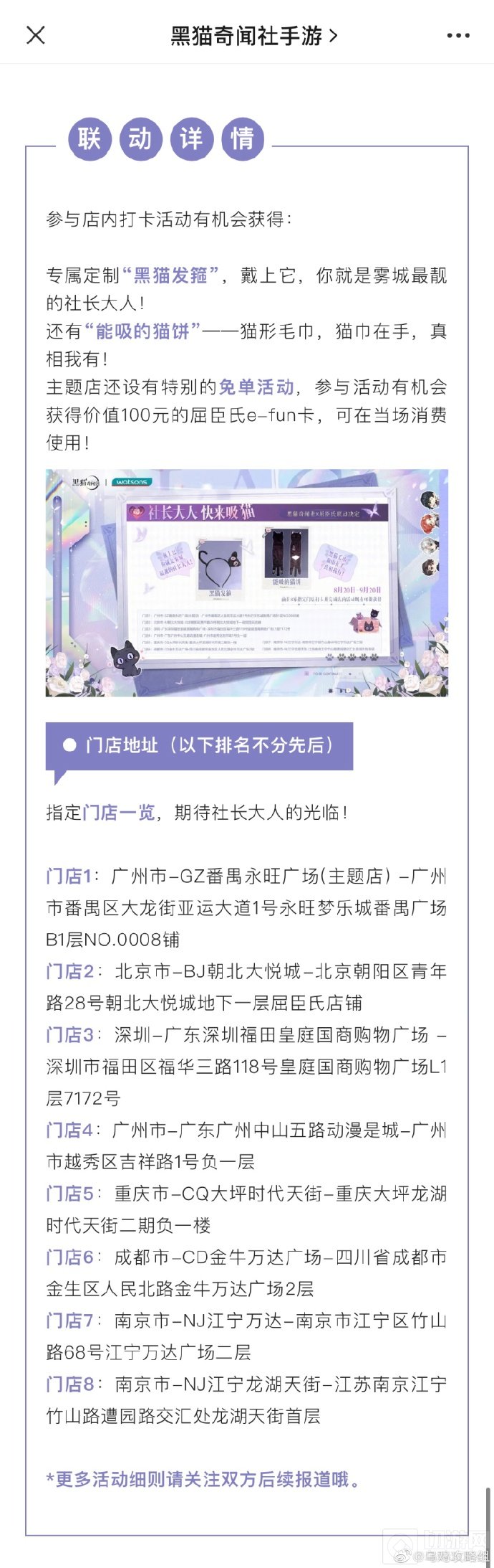 《黑猫奇闻社》游戏与屈臣氏开启了联动活动,店内打卡并且完成活动有机会获得专属定制“黑猫发箍”&“能吸的猫饼”(猫形毛巾),还有丰富奖励等小伙伴们领取,那么今天小编就给大家介绍一下黑猫奇闻社屈臣氏联动活动说明,有需要的小伙伴不要错过了。