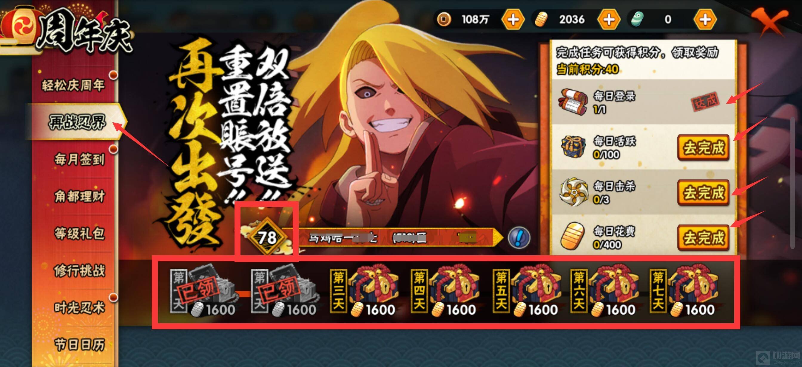 2、图下可以看到这个新区号,触发了再战忍界,是因为此账号在前面的区服有过78级的账号,所以此次在新区建号就拥有再战忍界活动,活动每天都可以领取大量金币,可以连续领取7天。