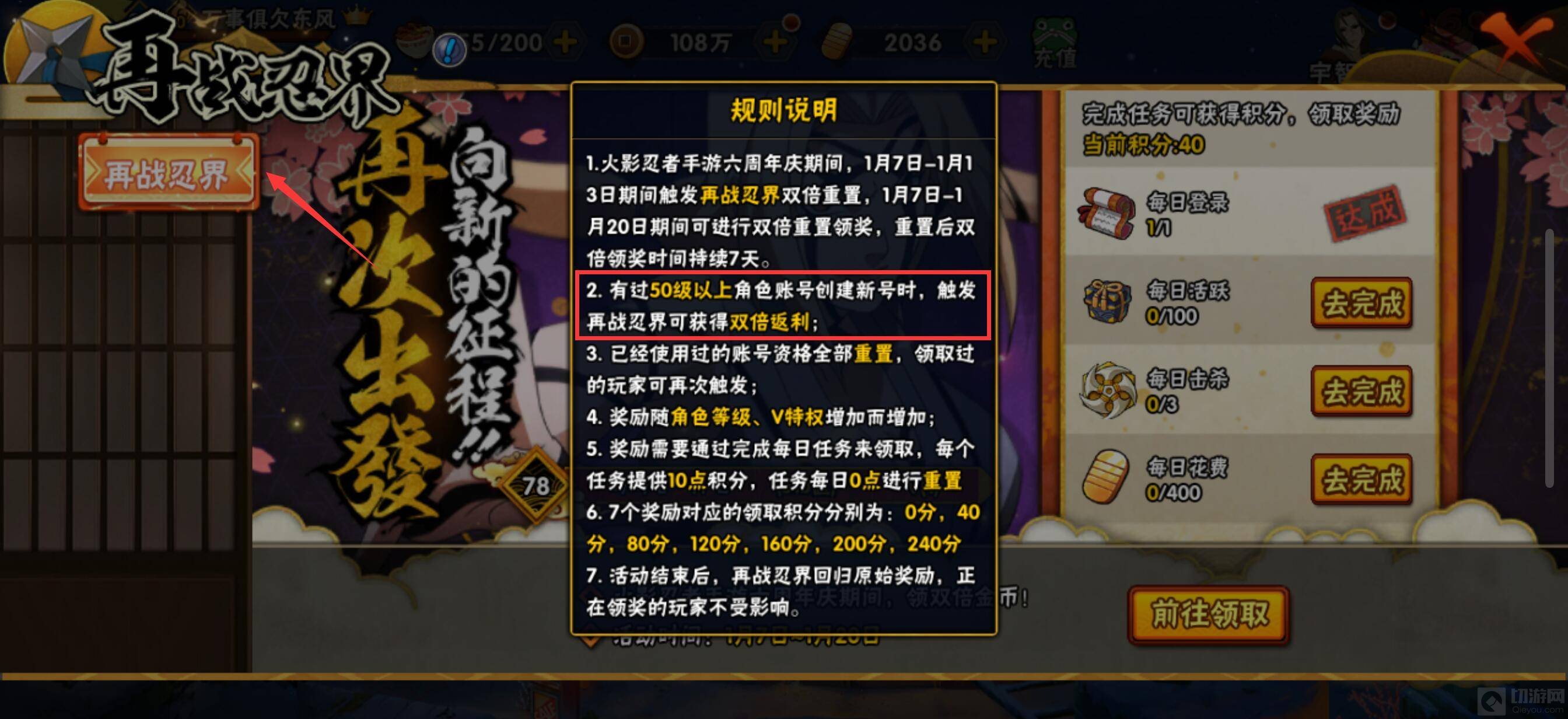 1、再战忍界只有老玩家重新建新区的号才有的活动,条件是:需要当前建新区这个账号,此账号前面的区服有过50级以上的角色账号才会触发,在1月7日-1月20日期间触发再战忍界可以获得双倍返利。