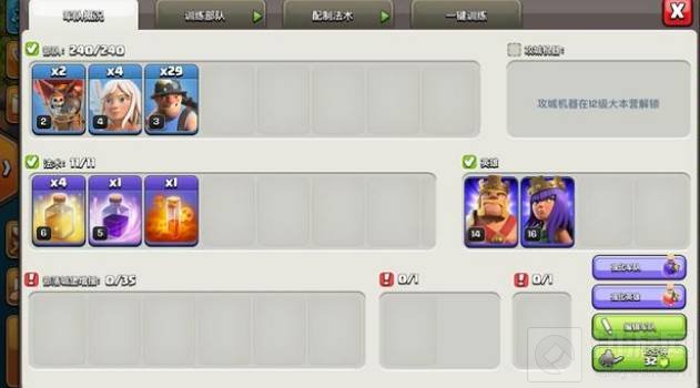 在配兵方面,可以选择四个天使两个气球作为天女组合的配兵,在开局的时候利用气球进行开路,防止天使被黑球意外打掉。除此之外可以将剩余兵种都选择为矿工,增加大部队的推进能力。而法术方面需要给天女留上一瓶狂暴,增加天女的爆发能力,给矿工留四瓶治疗药水,增加矿工的续航能力。而敌方援兵方面也要留意一下,如果女王等级低的话,那么就选择毒药法术减少敌方援兵的伤害。如果女王等级高,就选择冰冻法术,利用女王的技能进行杀援,减少法术的浪费!至于援兵,可以选择野猪骑士 双冰冻 攻城战车组合,辅助天女进行开路。