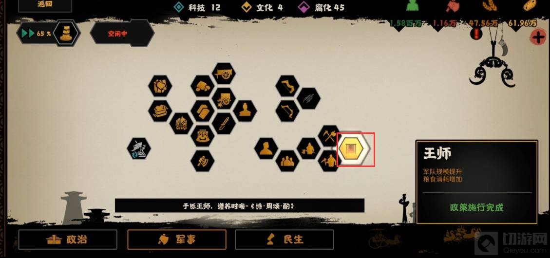 2、打开后找到军事政策一栏,就可以找到王师政策了,需要注意的是想要施行王师政策,需要先施行前置政策解锁。