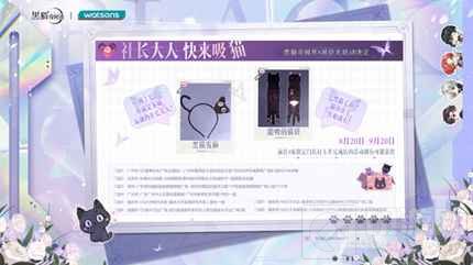 2022年8月20日-2022年9月20日期间,社长大人们可以前往北京、广州、深圳、重庆、成都、南京的指定屈臣氏店铺参与“隐秘的真相”及“黑猫真的有猫饼”活动,并完成对应任务,即可获得黑猫发箍、能吸的猫饼等线下定制专属奖励!