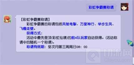 在活动当天的17:05,长安城会出现“彩虹争霸赛宝箱”,所有登上过彩虹仙境的玩家都可拾取并开启宝箱,有机会获得金刚石以及定魂珠等奖励。另外,本次彩虹争霸赛最先登顶彩虹仙境的前四队玩家还能自动获得“风驰电掣”、“万里神行”、“举步生风”、“飞檐走壁”称谓中的随机一个!
