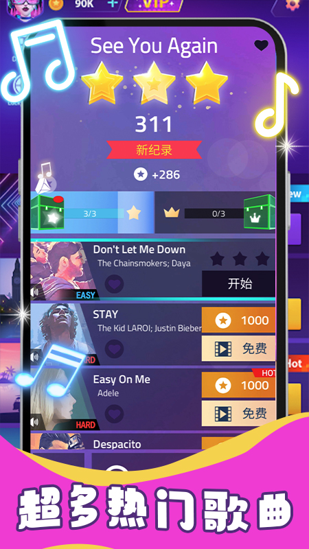 各种各样的音乐风格可供选择,海量国内外经典热门歌曲,包括经典钢琴曲、流行音乐、edm、嘻哈等等。音乐爱好者的盛宴!同时挑战您的反应能力和手眼协调能力。