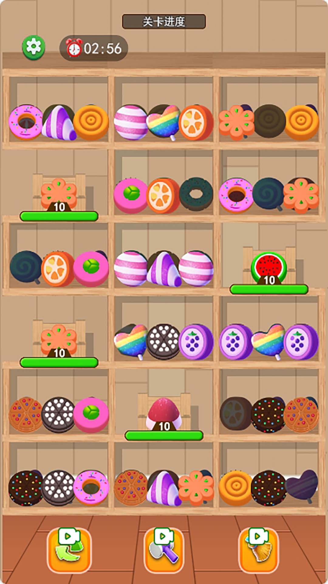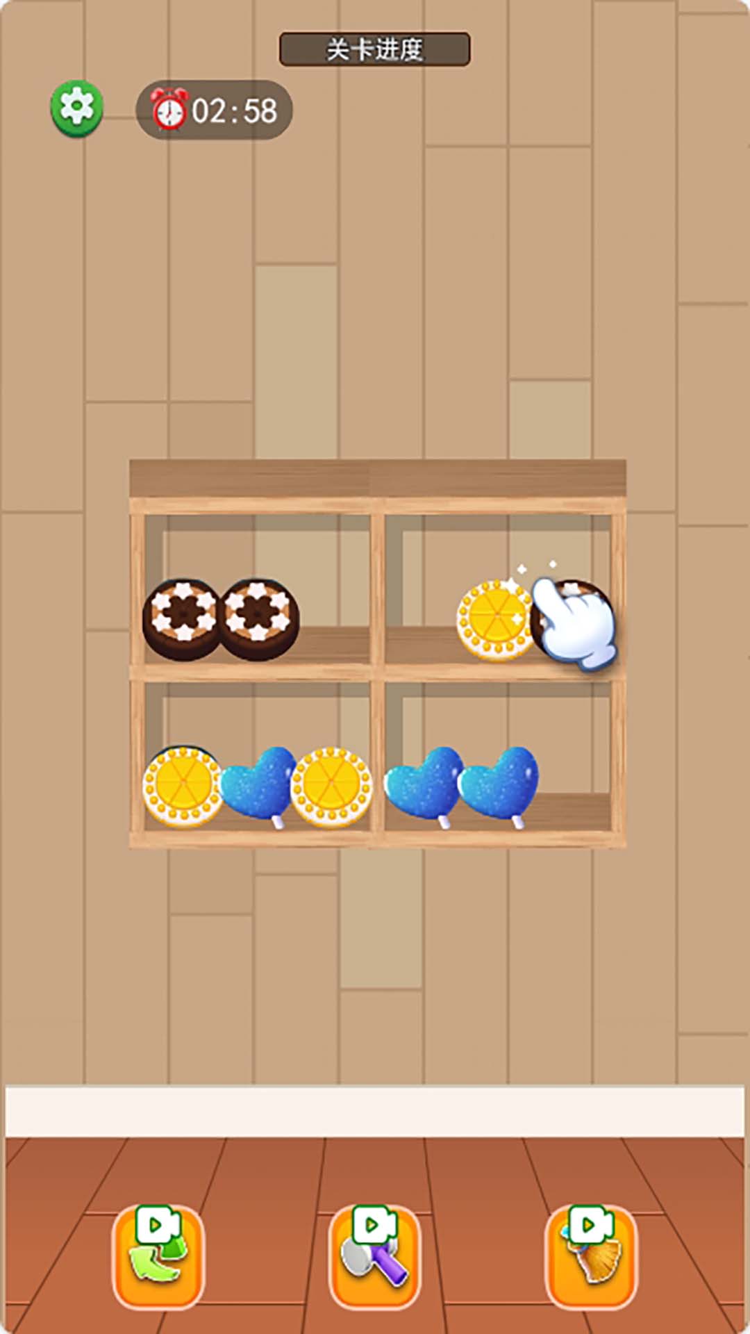 货柜爱整理是一款消除类休闲游戏,货柜架上的物品杂乱无章,花点时间把物品整理下清空货柜吧。让三个一样的物品放在货柜的一个格子内消除掉这三个物品,把货架上所有物品清空,根据游戏难易程度分为三个关卡,关卡全部通关获得胜利。