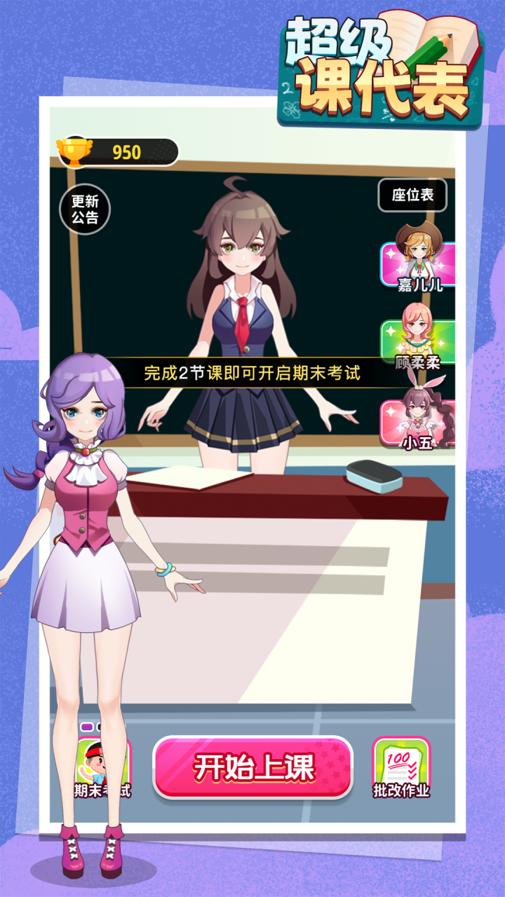 2.游戏内容丰富,不仅有课堂模式自选课程,分别有语文,数学,英语,彩妆等,后续还会新增不同课程玩法,还有抽查作业批改作业等环节,十分解乏;