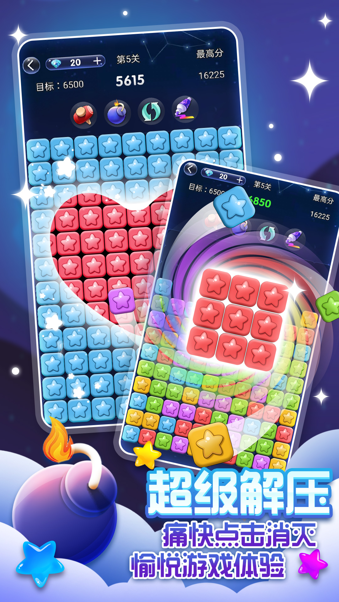快来消灭星星,经典好玩的消除游戏!星心合一全新升级! 休闲放松玩一玩,无聊玩一玩,等车等人玩一玩,公交地铁玩一玩,随时随地玩一玩!还能保存游戏进度,让你随时继续玩!疯狂消灭星星,闯关停不下! 游戏玩法: * 玩法超简单,消除相邻的2个或以上的同色星星。 * 消除相连星星越多,得到的分数越高。 * 剩余星星越少,奖励的分数越高。 * 没有时间限制,达到每关目标分数即可通关。