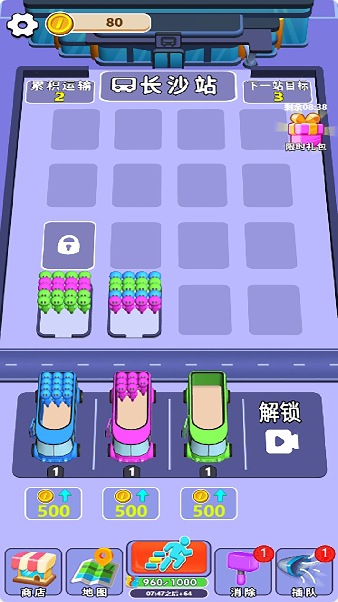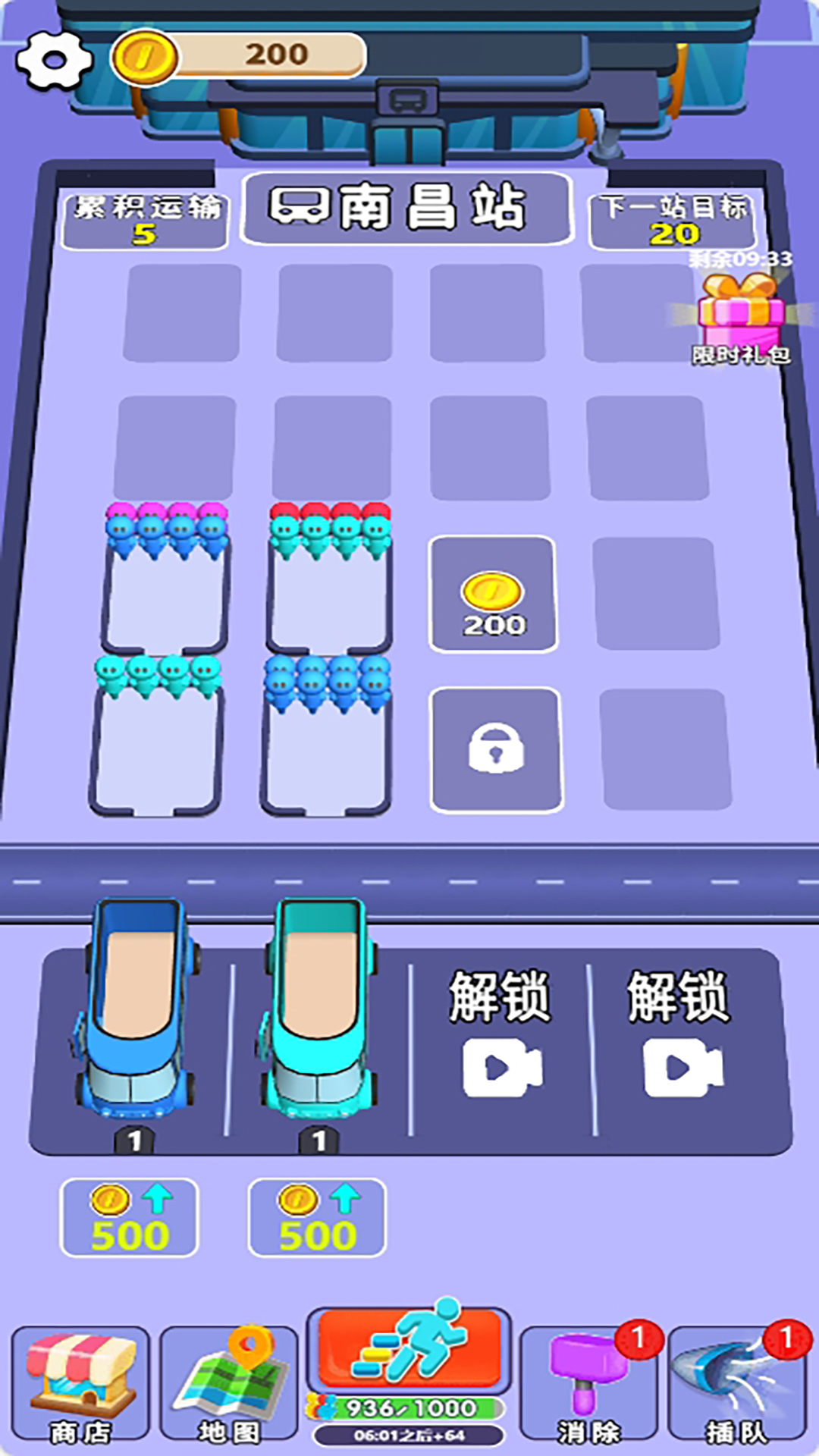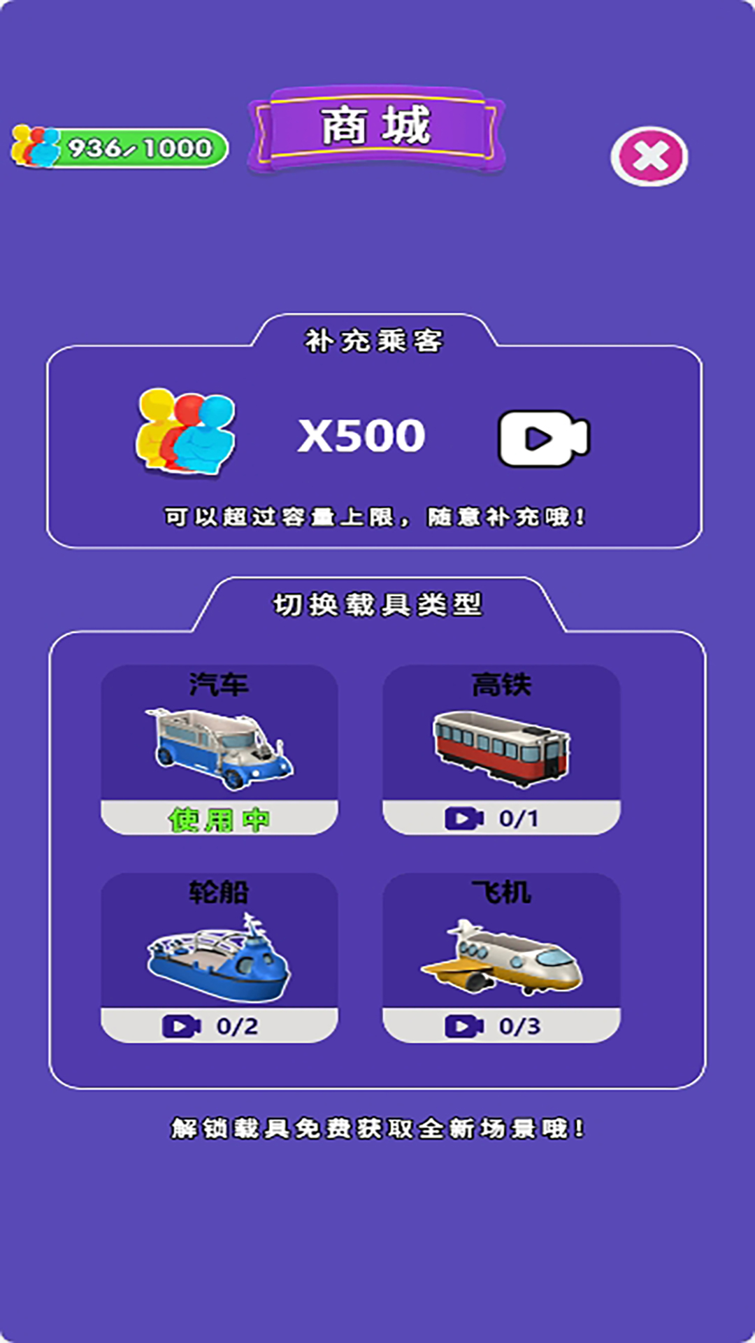 游戏使用方法:点击屏幕中等候区,选中前排颜色相同的乘客放在一起,相同颜色的乘客移到对应颜色的车上,点击屏幕下方小人按钮可以让更多的乘客进站候车,完成所有目标解锁下一个关卡,可以使用道具更快通关。