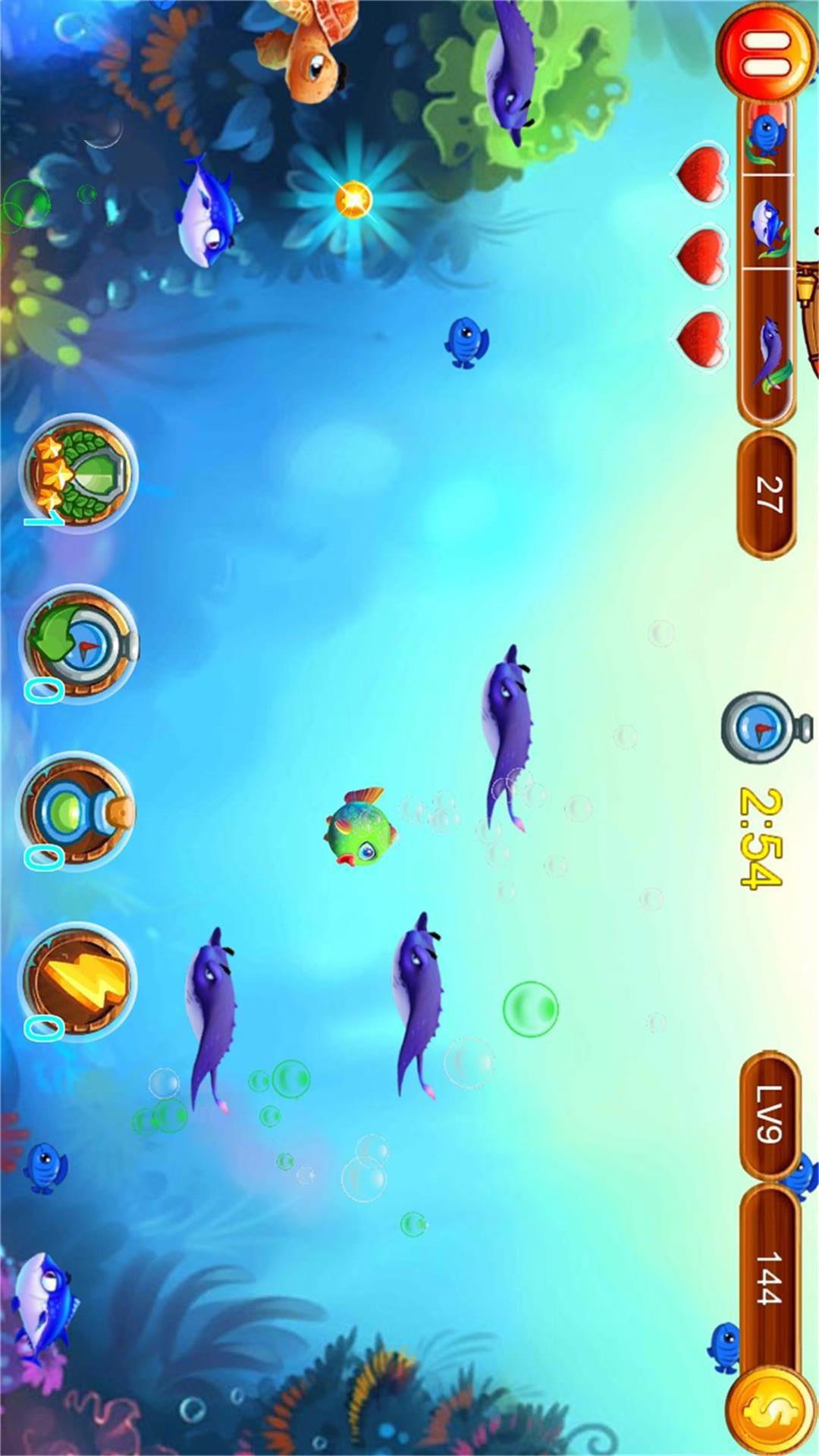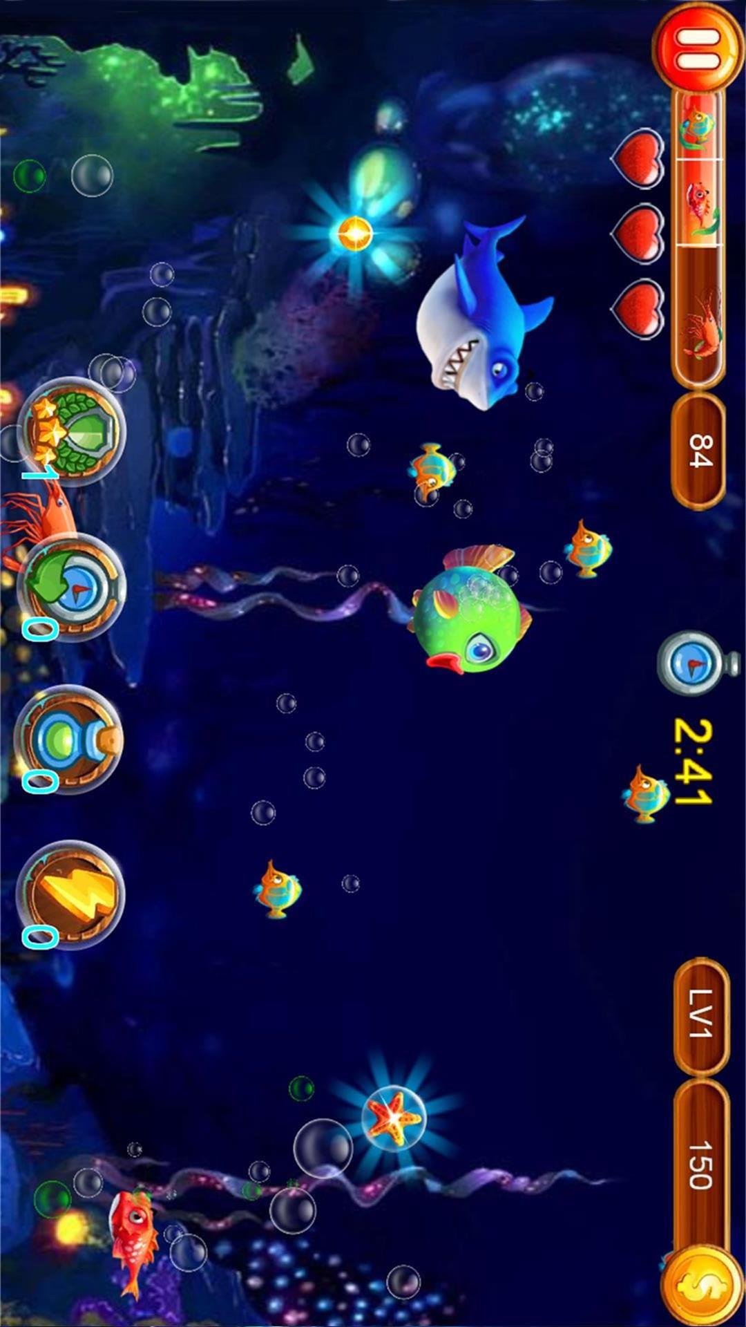 这是一款冒险类游戏,你将化身成一只小鱼 在充满各种鱼的海洋里,想要生存,你就必须吃掉比你小的鱼来逐渐长大, 然后你就能不断挑战体积更大的鱼。 除此之外,游戏还有丰富的道具,帮助你更快成长以及躲避凶猛的大鱼, 在这个游戏里面你只有一个任务,那就是吃吃吃,吃货们,准备好了吗?