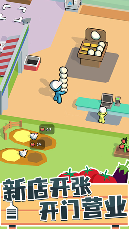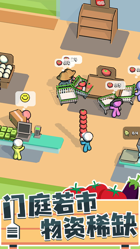 游戏操作简单,玩家只需要通过长按屏幕,通过摇杆控制角色进行移动,玩家需要时刻注意商品的消耗数量,避免客人的购物热情高涨时候没有物品进行出售,客人可能就会走掉哟!